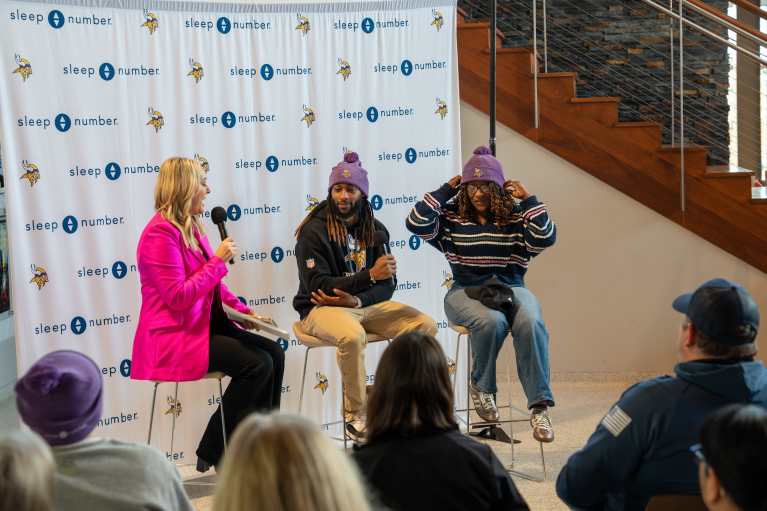 This month, Sleep Number joined the Minnesota Vikings and Blue Star Families to host a fireside chat for 30 military spouses. Participants spent a memorable afternoon at the Vikings Performance Facility, where they got to chat with some very special guests.